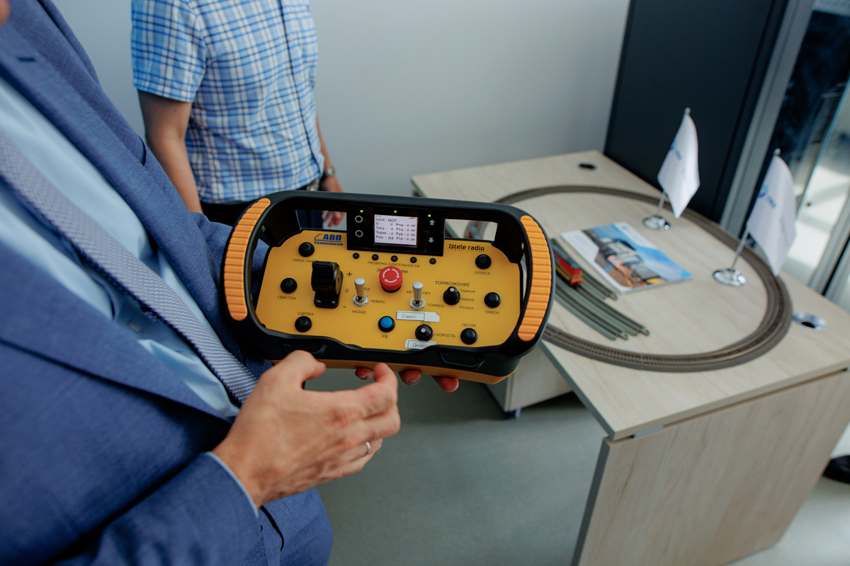 The guests were especially interested in the shunting locomotive remote control system using a portable remote control. It is capable of controlling one or more shunting locomotives at a distance of up to 1000 m via radio. This system can be used in combination with an obstacle detection system, which performs safety functions for remote locomotive control.