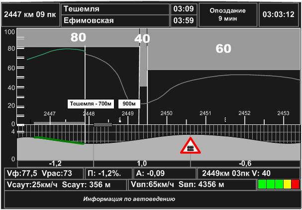 On-board equipment is installed on the locomotive and includes a color graphic display, where driver can see engine parameters, speed, coordinates, track profile, locomotive traffic lights, current and next speed limits, nearest track objects and stations, information on performed schedule , etc. The system allows driver to implement various motion modes - according to the schedule, station-to-station driving time, advisor mode, “virtual coupling” mode (CTRL@CONNECT)